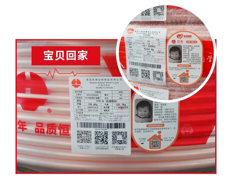 宏泰在銅管產品包裝上添加“寶貝回家”公益廣告,上面有兒童信息、官網二維碼和簡短宣傳語,讓產品成為流動的宣傳媒介。