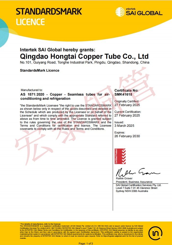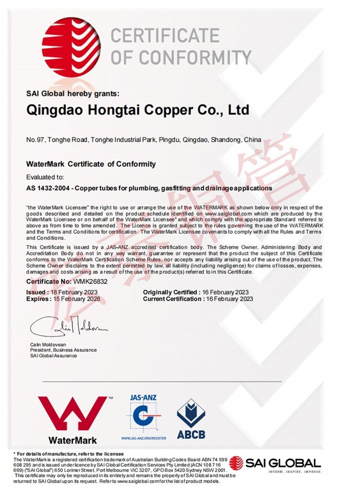 宏泰銅管產(chǎn)品順利通過AS 1571無縫制冷用銅管標(biāo)準(zhǔn)認(rèn)證【證書編號(hào):SMK41618】和AS 1432給排水銅管標(biāo)準(zhǔn)認(rèn)證【證書編號(hào):WMK26832】。