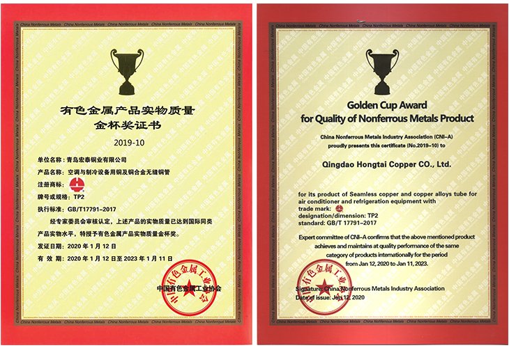 2019年10月至12月,中國有色金屬工業(yè)協(xié)會專家委員會對青島宏泰銅業(yè)有限公司申報的空調(diào)與制冷設(shè)備用銅及銅合金無縫管進行實地審核和答疑。經(jīng)專家委員會審核認(rèn)定:青島宏泰銅業(yè)有限公司申報的空調(diào)與制冷設(shè)備用銅及銅合金無縫管的實物質(zhì)量達(dá)到了國際同類產(chǎn)品實物質(zhì)量,特授予有色金屬產(chǎn)品實物質(zhì)量金杯獎。