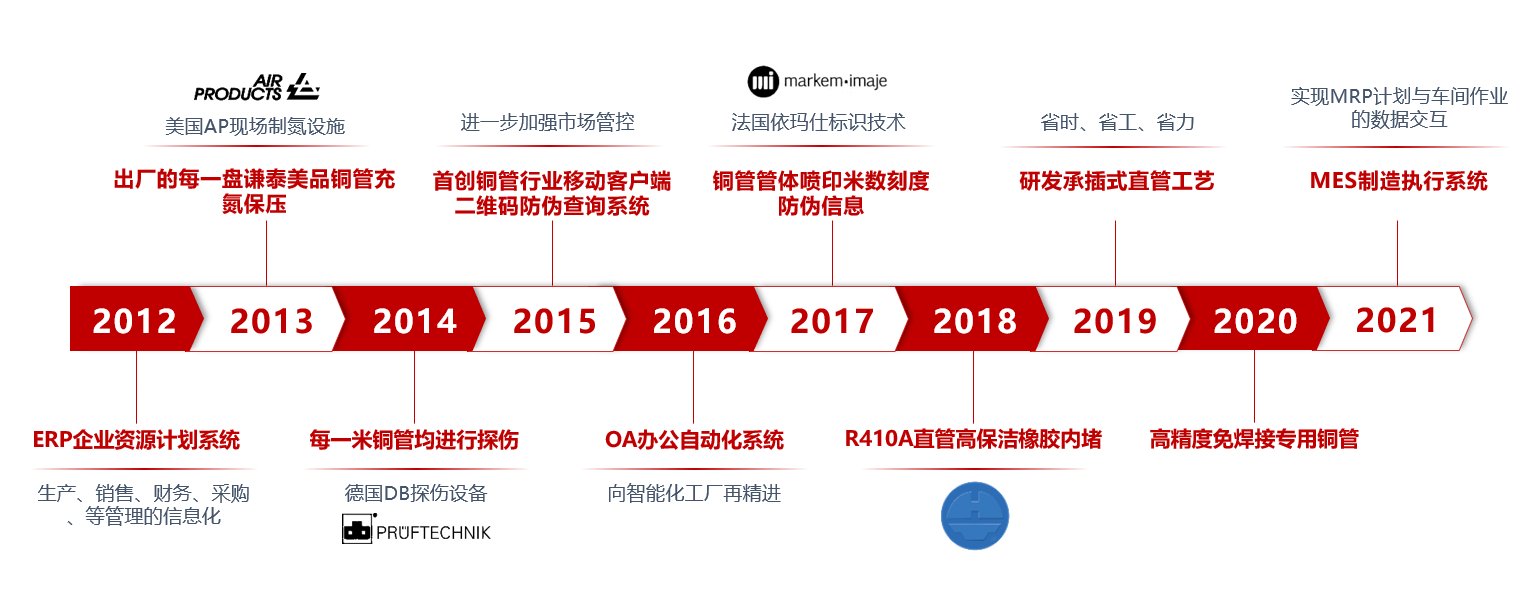 要在前有標兵、后有追兵漸進的形勢下保持強勁的發展勢頭,非要做好創新發展這塊大文章不可。三年的現代化管理,李福鵬不斷深化市場認識,強化決策管理,抓好過程控制,搶抓市場機遇,實施精益管理,優化生產組織模式,使企業內部潛力不斷釋放,核心競爭力和抗風險能力不斷增強。為了更快速接觸市場和滿足客戶需求,他提出管理信息化、生產數字化、市場電商化、決策數據化的宏泰四化建設,在2010年引進先進的ERP企業管理系統的基礎上,2015年引進OA辦公自動化系統,2020年開始在生產部全部推行MES系統,2021年成立互聯網小組,2022年引入SCM供應鏈管理系統,帶領宏泰人在四化建設的道路上不斷邁進,宏泰管理思維模式也不斷從粗放式管理到精細化管理轉變。要在前有標兵、后有追兵漸進的形勢下保持強勁的發展勢頭,非要做好創新發展這塊大文章不可。李福鵬以滿足市場客戶需求為關注焦點,通過產品研發創新,將宏泰銅管做成宏泰精品,做出謙泰美品。針對客戶安裝的痛點,創新出宏泰承插式直管,節省人工、焊料、紫銅管件,并減少泄露風險,迅速得到客戶的認可。